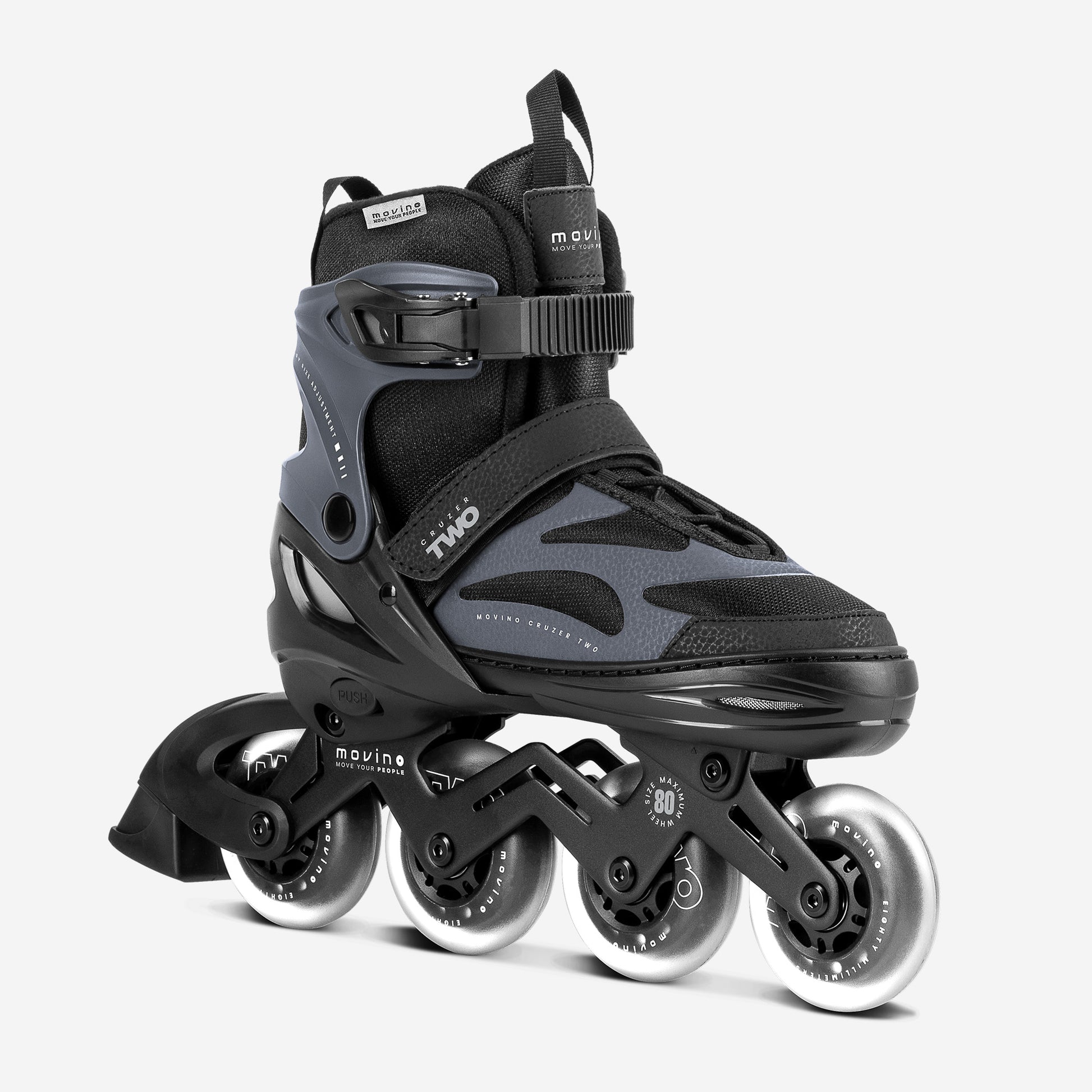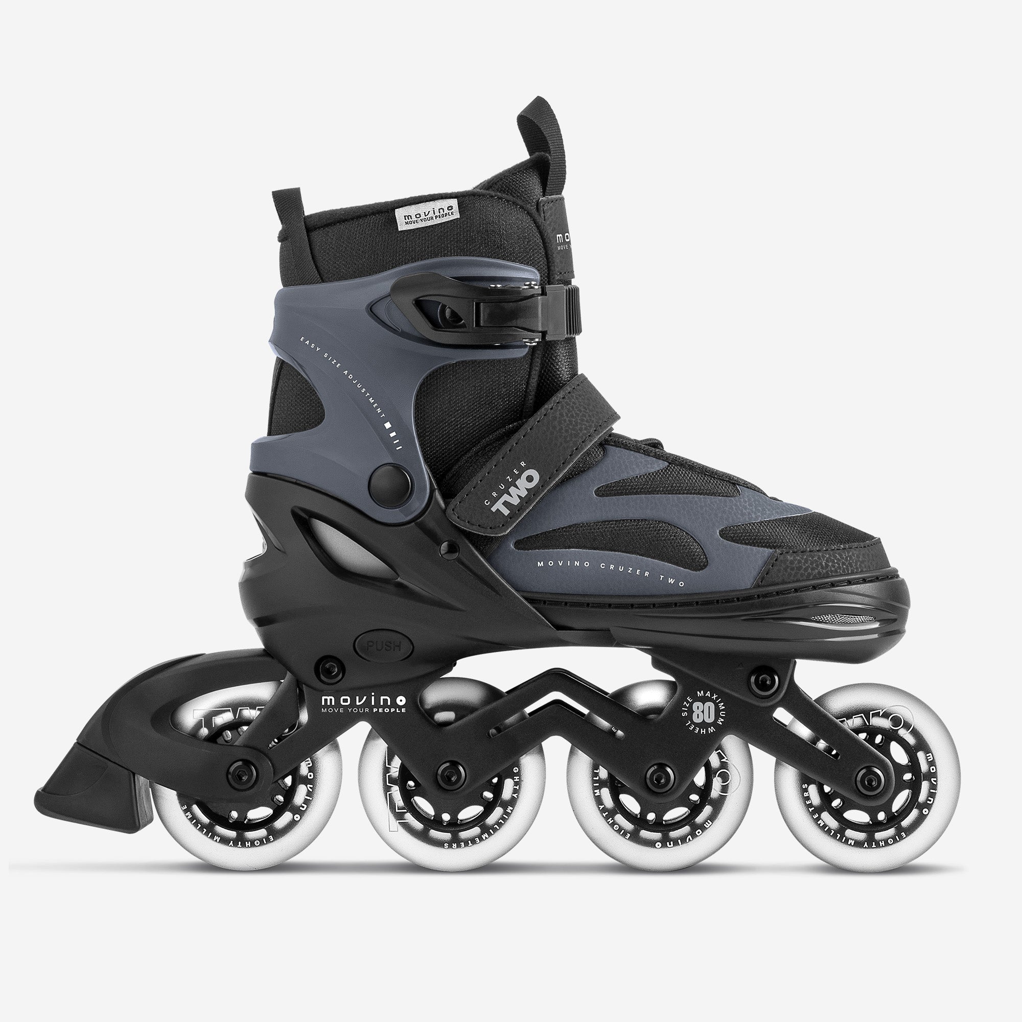 Easy Size Adjustment The Movino Cruzer Two was designed for many seasons of skating activity. The quick and convenient 4-step adjustment system allows you to set the perfect boot length. Simply undo the Velcro strap and press the "PUSH" button.