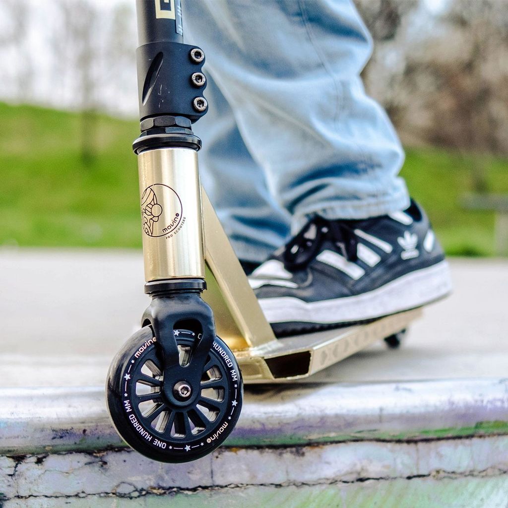 If you’re a rider constantly learning new tricks, the Movino Glide is the scooter for you. Its aluminum deck, measuring 48 x 11 cm, is not only lightweight but also durable.