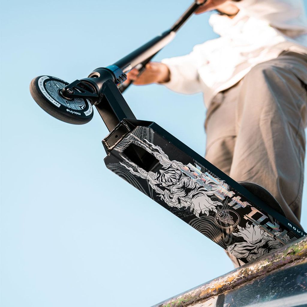 Introducing our Haze scooter, featuring a striking design that is sure to catch your eye. The iconic Movino skull is prominently displayed on the deck and can also be found on the new grips. But that’s not all! Take a peek underneath the deck and prepare to be amazed. What appears to be a mild-mannered scooter transforms into a true conqueror of park obstacles, igniting your passion and awakening your competitive spirit - with this gear, no trick is too challenging.