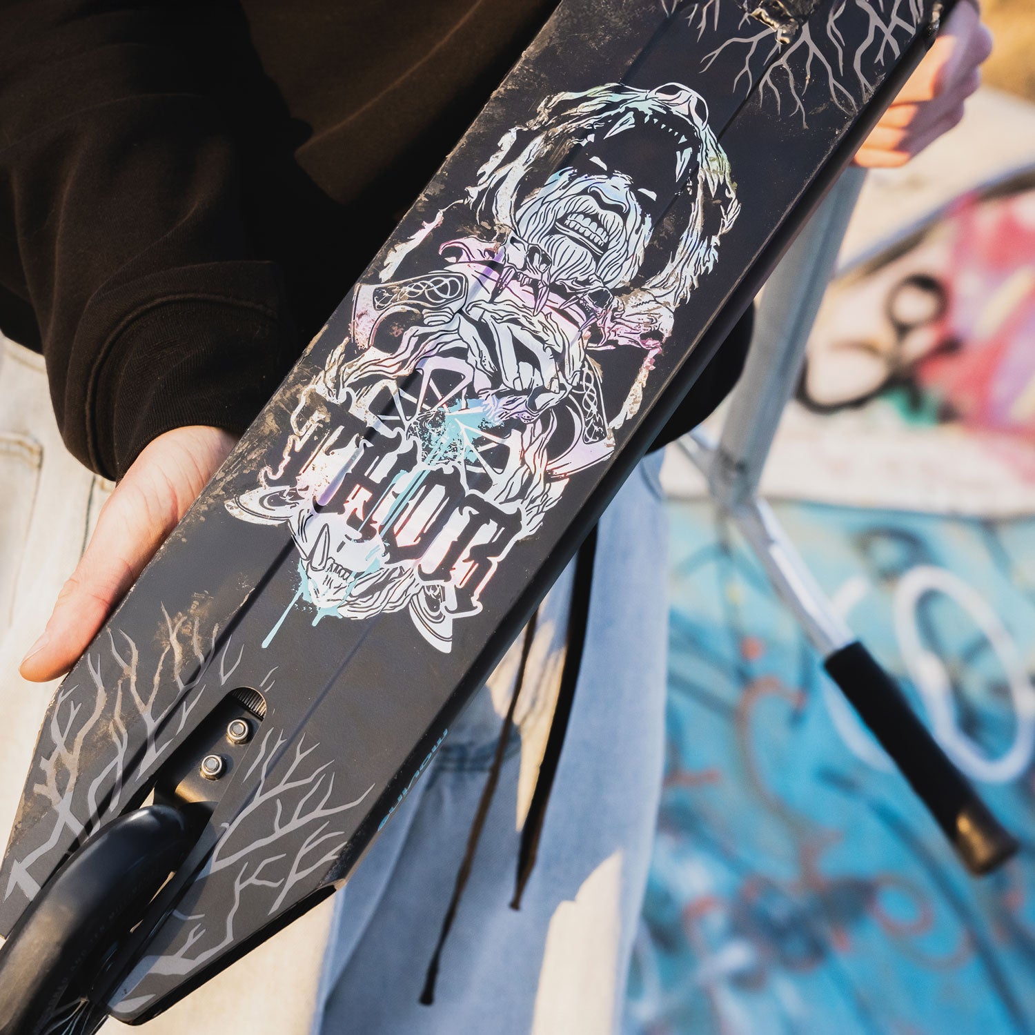 The new Thor features an enhanced deck which is even more durable, while standing out in style. Slightly lighter, with a length of 48 cm and a width of 12 cm, made from high-quality aluminium, and cut in a peg-cut shape, it will help you overcome any obstacle at the skatepark. To strengthen its construction, we have applied a special cutout at the bottom. Thanks to these changes, the scooter has gained greater lightness (weighing 3.3 kg) without losing any of its durability and sturdiness.