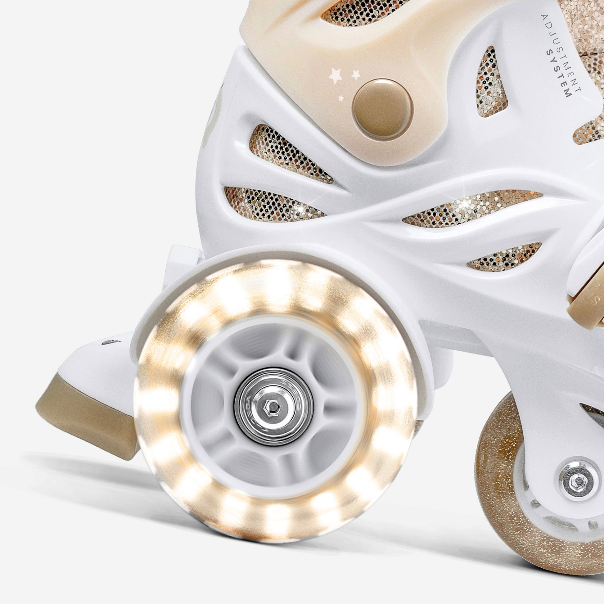 Cariboo Ballerina skates make those first steps on wheels easy, instantly building confidence. The innovative wheel setup combines two smaller front wheels (inspired by classic inline skates) with two larger rear wheels (set up like quad skates). This hybrid combination provides maximum stability and balance, turning every move into a broad smile.